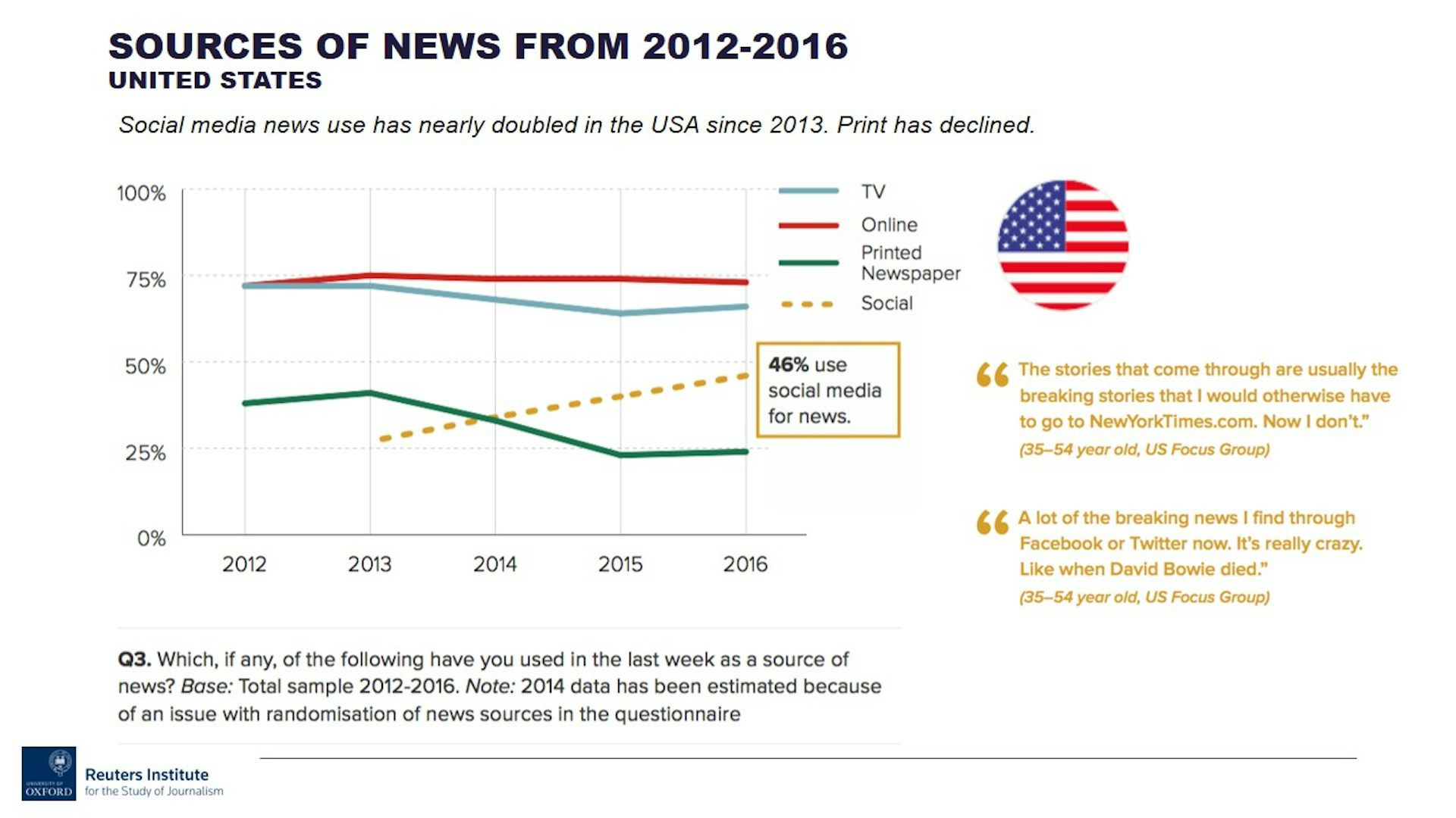 Data from comScore recently revealed that, in the U.S., social media accounts for 20% of total time spent online. It follows that 46 percent of our DNR American sample named social media such as Facebook or Twitter as a source of news; that’s almost twice the number who did in 2013. In the U.K., this figure is slightly lower (35 percent). Meanwhile, 14 percent in the U.S. and 8 percent in the U.K. cite social media as their main source of news.