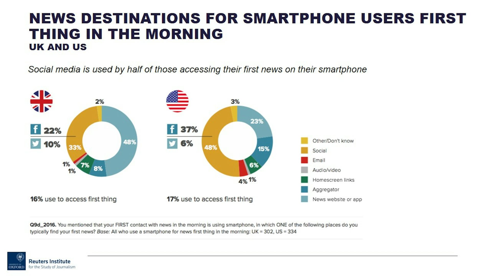 Of those using a smartphone to access the news first thing in the morning, nearly half in the U.S. (48 percent) go to social media as their first source, compared to only one third (33 percent) in the U.K. U.K. smartphone users are more than twice as likely as their U.S. counterparts to use their smartphone first thing to go direct to a news website or news app (U.K. 48 percent versus U.S. 23 percent).